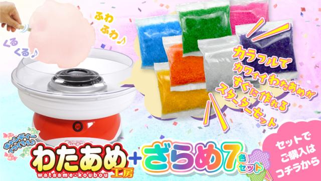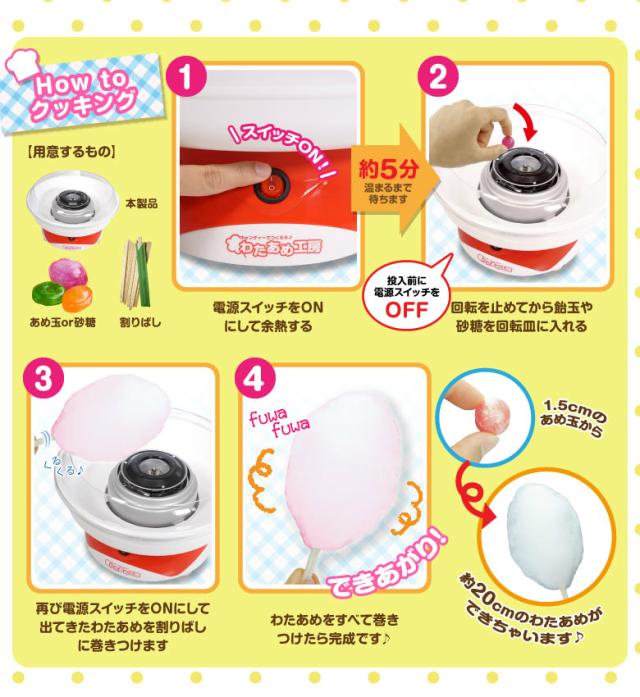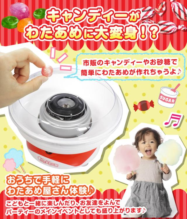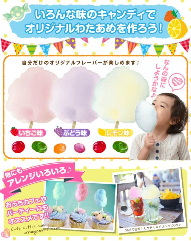 商品説明:アメ玉やザラメから綿あめが作れます。色んな味のキャンディでオリジナルのわたあめを作ろう♪