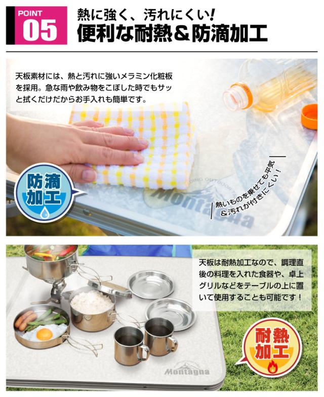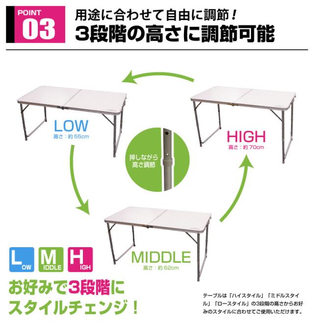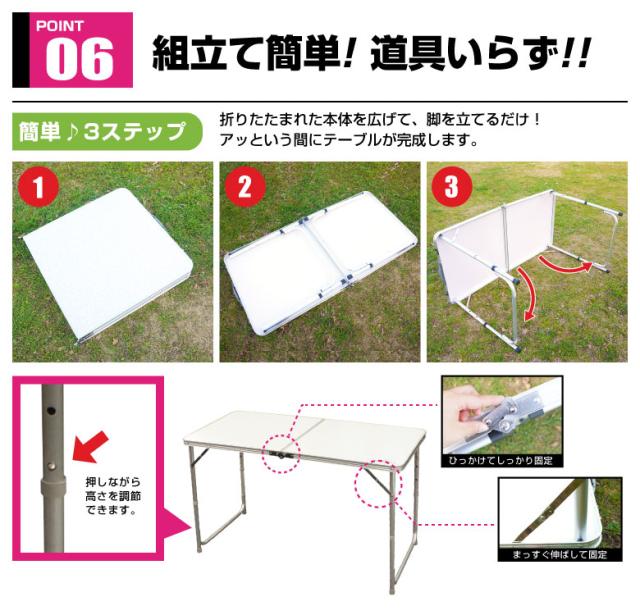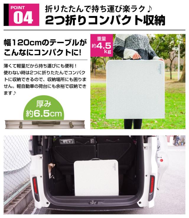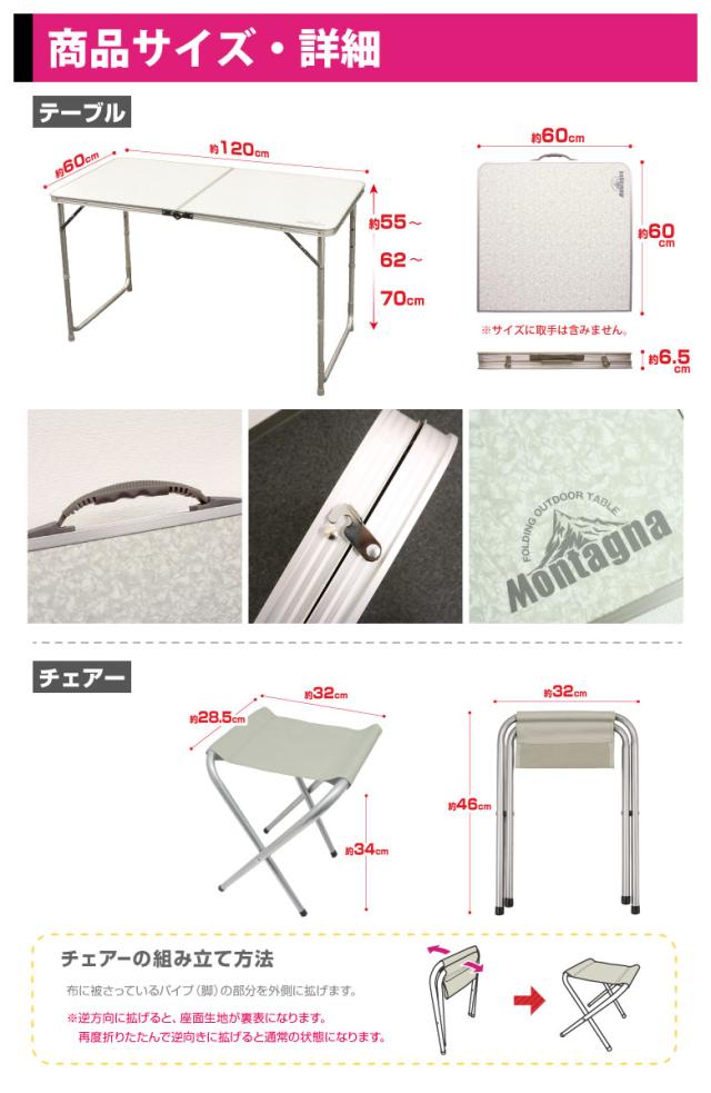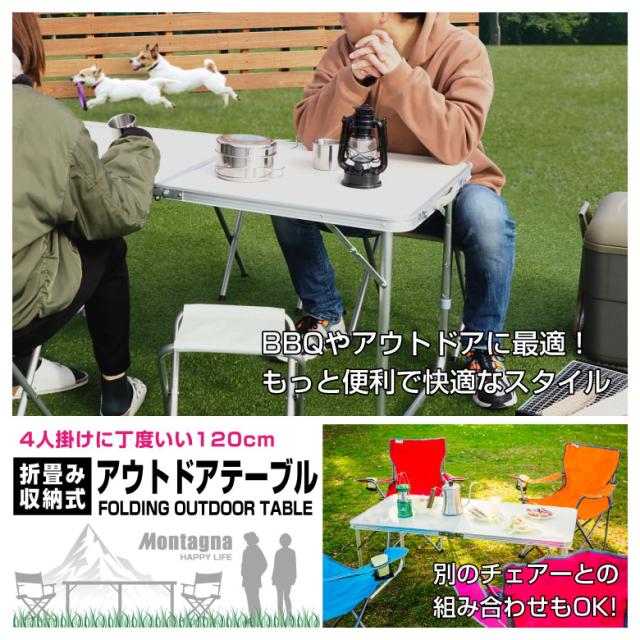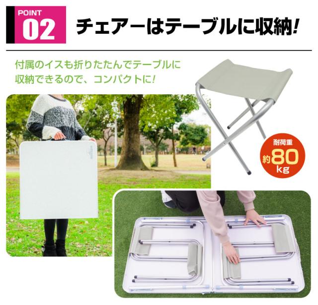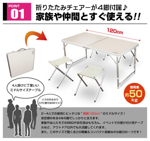 商品説明:アウトドアに最適な横幅120cmの折りたたみテーブルとチェア4脚のセットです。チェアはテーブルに収納できるので荷物もすっきり。組み立てもカンタンにできます。好みに合わせて高さを2段階調節できます。(3段階の高さ)