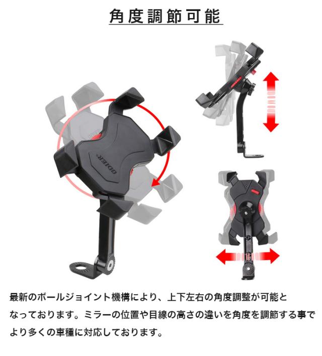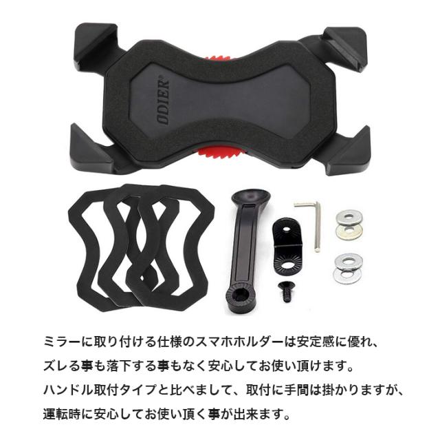 ミラーに取り付ける仕様のスマホホルダーは安定感に優れ、ズレる事も落下する事もなく安心してお使い頂けます。ハンドル取付タイプと比べまして、取付に手間は掛かりますが、運転時に安心してお使い頂く事が出来ます。