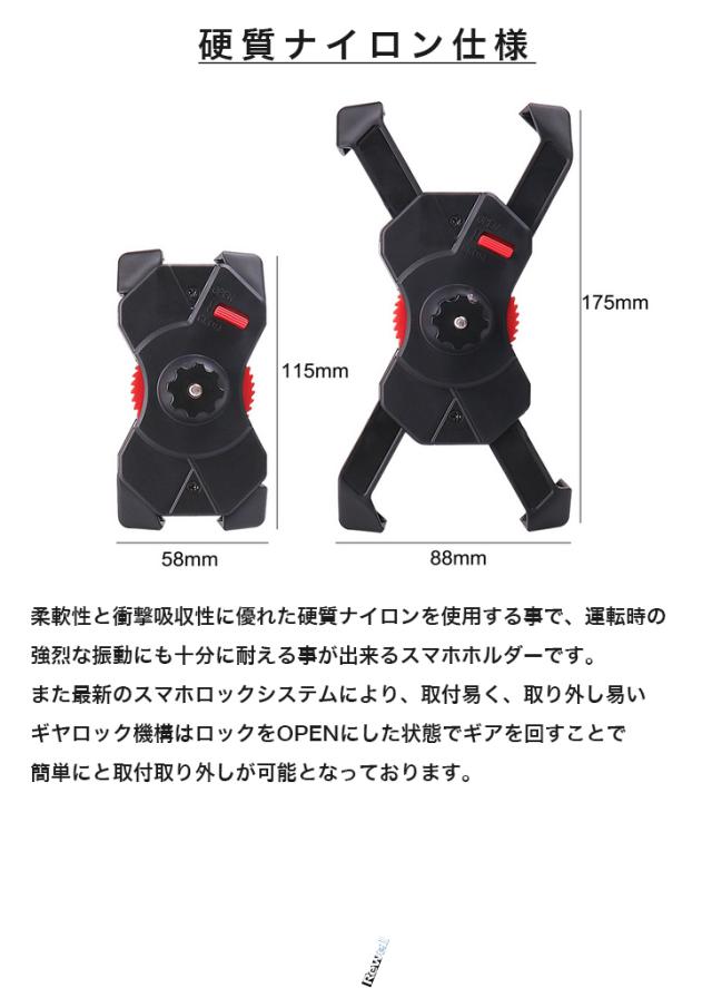 柔軟性と衝撃吸収性に優れた硬質ナイロンを使用する事で、運転時の強烈な振動にも十分に耐える事が出来るスマホホルダーです。プラスチック等と比べて劣化のしにくい素材なので、より長くお使い頂けます。また最新のスマホロックシステムにより、取付易く、取り外し易いギヤロック機構はロックをOPENにした状態でギアを回すことで簡単にと取付取り外しが可能となっております。