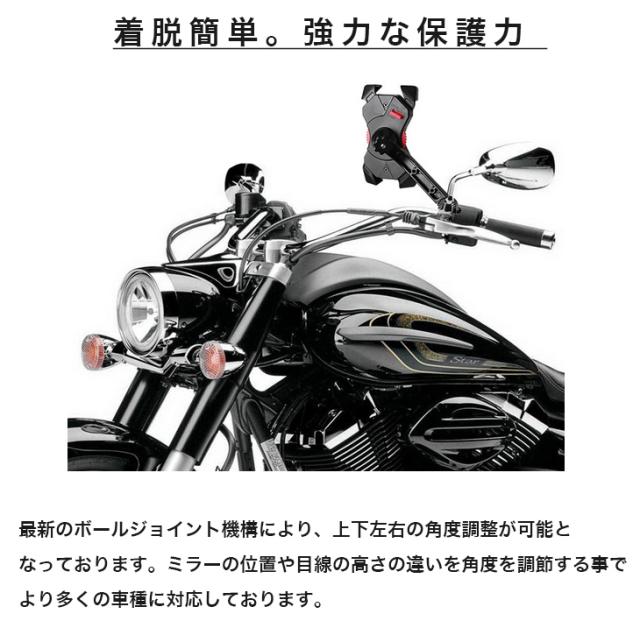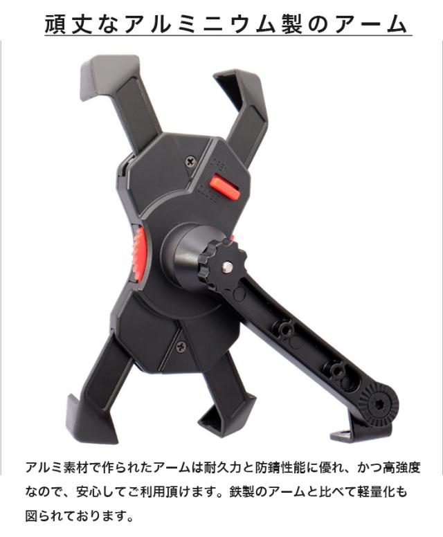 アルミ素材で作られたアームは耐久力と防錆性能に優れ、かつ高強度なので、安心してご利用頂けます。鉄製のアームと比べて軽量化も図られております。ハンドルパイプ等に取り付けるタイプの バイク スマホホルダー と比べて バイク ミラー に取付ける仕様なのでより安定したご使用が出来ます。
