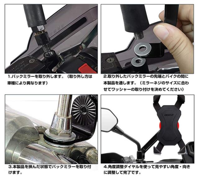 - スクーターのミラー部分に取り付けました!簡単に取り付け出来て走行しました。購入前は走行中の振動で案外ブレルと思ってたけど、そこまでなく買って良かったと思いました!スマホの脱着も簡単にできて良い品だと思います!