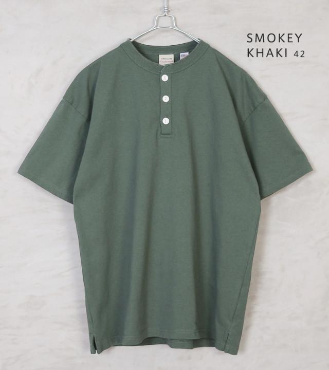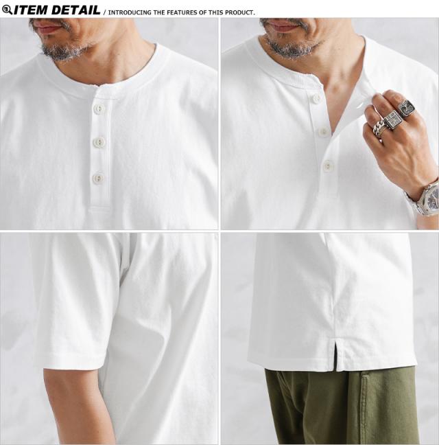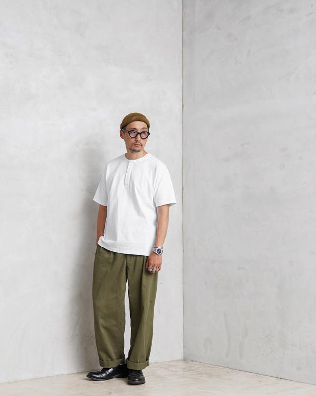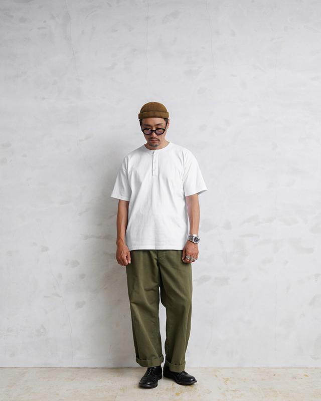 アメリカコットン特有のドライ感に肉厚で縫製強度の高いタフなボディは、着用回数を重ねるほどに体に馴染み雰囲気が増していくので育てる楽しみがある一枚。ベーシックなシルエットとシンプルなヘンリーネックデザインに、どんなコーディネイトにも合わせやすいカラーバリエーションは普段のワークウェアからミリタリー・アメカジスタイルに何枚あっても困らない着回し優秀アイテムです。
