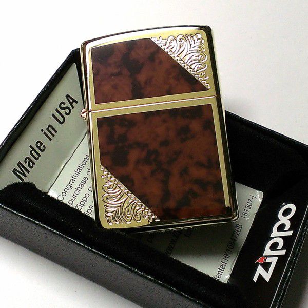 ゴールド色の本体に、アラベスク模様の彫刻とブラウンのマーブル柄をデザインした高級感あるZIPPOライター。
