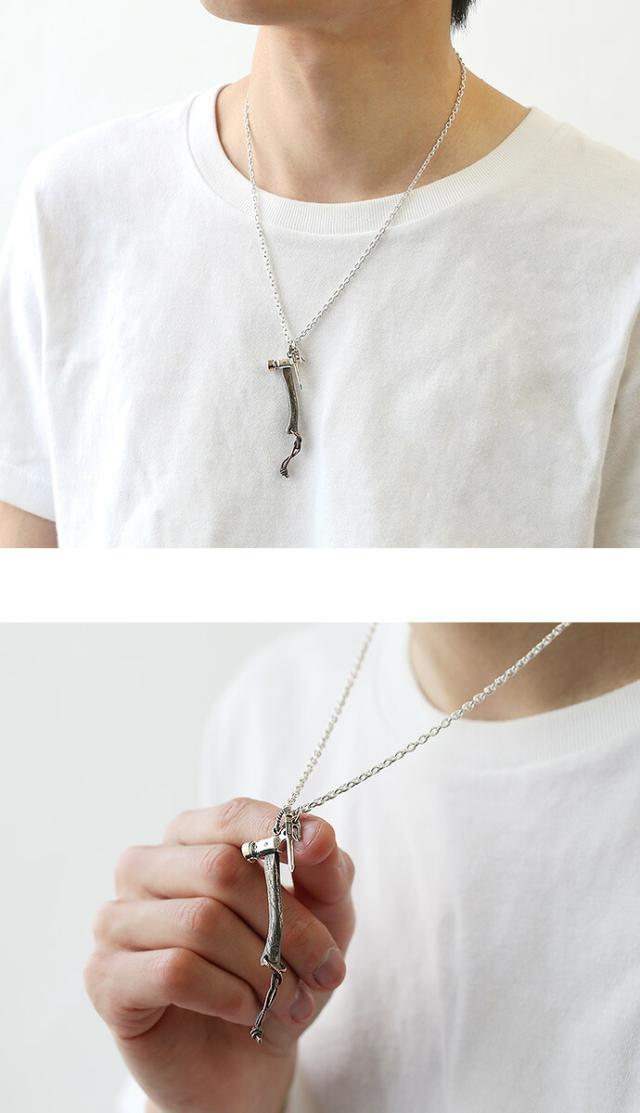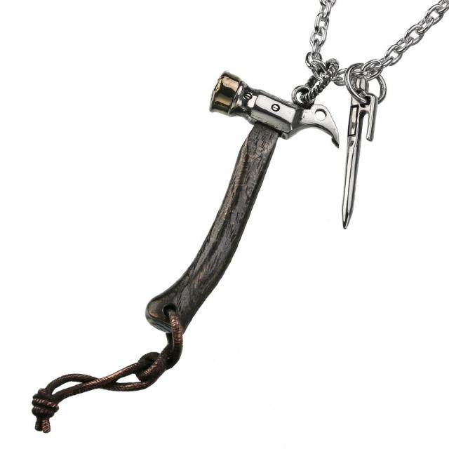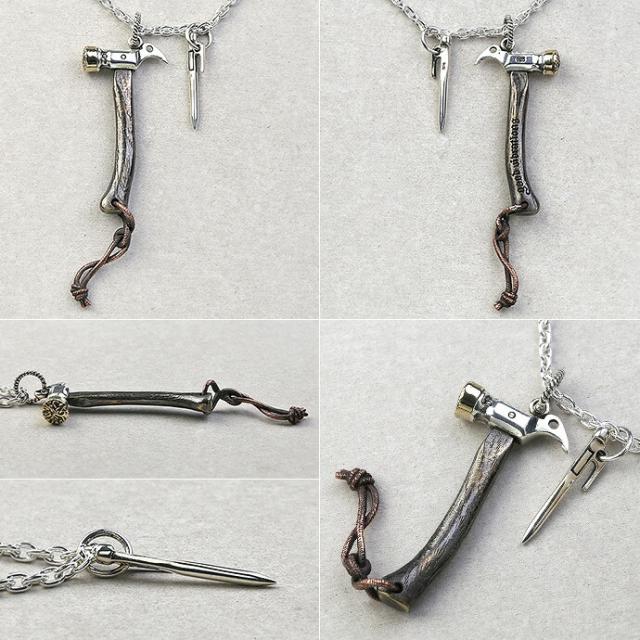 テントを張るのに使用するペグとペグハンマーをモチーフにしたペンダントのセットです。ロープやハンマーの柄の部分など、繊細な彫金でリアリティのある造りになっています。アウトドア系やアメカジ系の服に合わせて着けたくなる、キャンプアイテムアクセです。