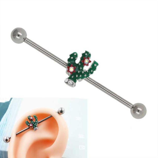 緑色にエナメルコーティングした仙人掌(サボテン)に赤色の花が咲いたフラワーサボテンを長いロングバーベルにセットした14ゲージのインダストリアル用のボディピアス。