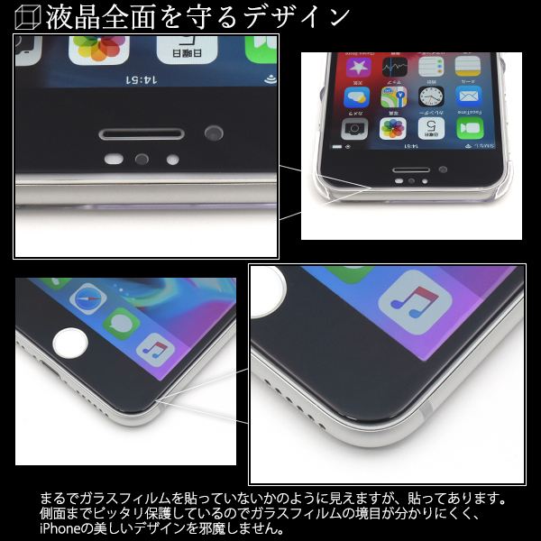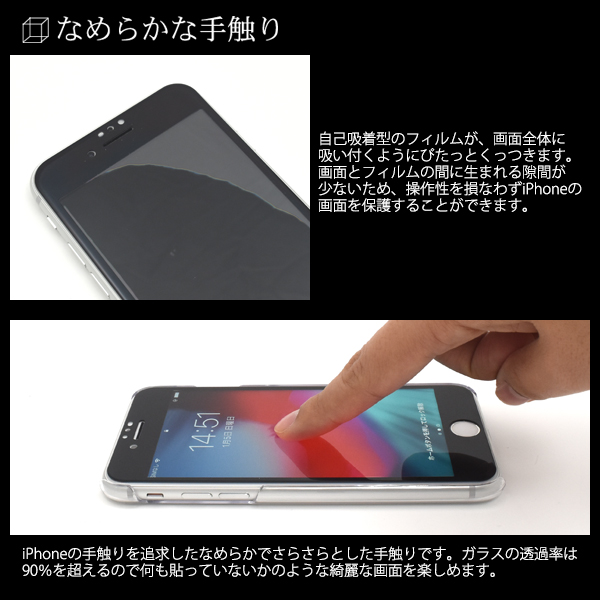 iPhoneのデザインを邪魔しないデザインでフィルムを貼っていることを感じさせません。液晶画面部分のガラスはキズがつきにくく、透過率90%を超えた頑丈なガラスを使用。手触りはなめらか。万が一のために飛散防止加工も施されているので、 割れてしまっても破片が飛び散りません。また自己吸着タイプで、画面全体に吸い付くようにぴたっとくっつきます。画面とフィルムの間に生まれる隙間が少ないため、 操作性を損なわずiPhoneの画面を保護することができます。 間違えても貼りなおし可能です。クリーナークロスも付属しています。