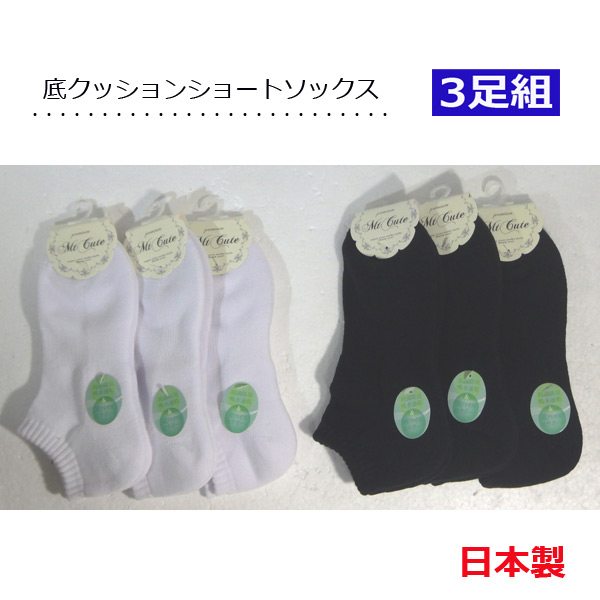 底クッション ショートソックス 3足組 日本製 白無地 黒無地 レディース靴下