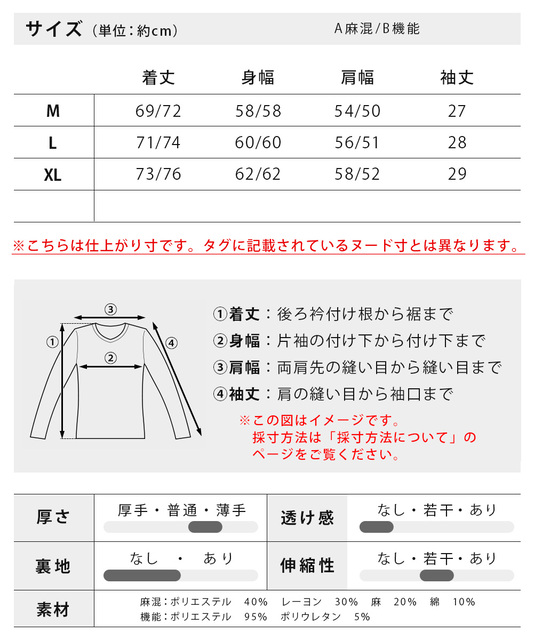 | A.麻混・サイズ | 着丈 | 身幅 | 肩幅 | 袖丈 |
