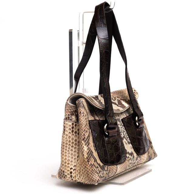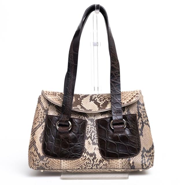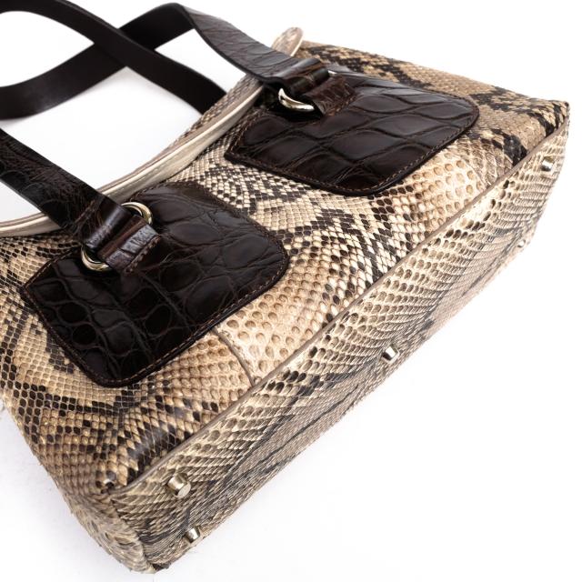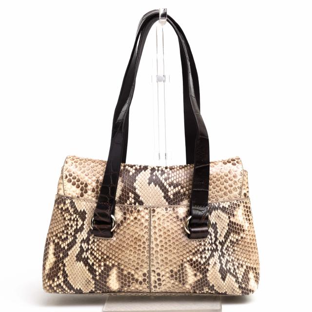 素材には高級感溢れるパイソンレザーを採用し、個性的なハンドバッグ。内側は仕切りがありますのでしっかりと収納でき荷物の出し入れもしやすいです。とても軽く素材感が映えるシンプルながらもエレガントなデザイン。長く使い込むほどに、いい風合いが出てくるので、長く愛用していただけます。