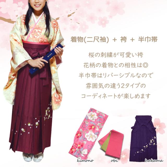 二尺袖着物、袴、半巾帯の組み合わせがお客様自身で自由にコーディネートできるセットです。