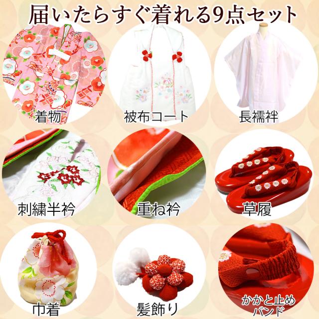 着物(伊達衿2枚付)・長襦袢(半衿付)・被布・草履・巾着・髪飾り・かかと止め