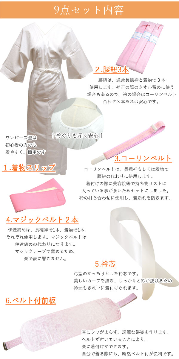 着物スリップ 腰紐3本 衿芯 コーリンベルト 前板 マジックベルト2本