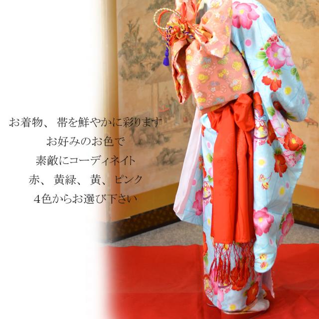 しっかりとした厚みがあり、発色も美しいため、正絹のお着物にもお勧めのお品です。ポリエステルなので、しわになりにくく、お手入れも簡単です。