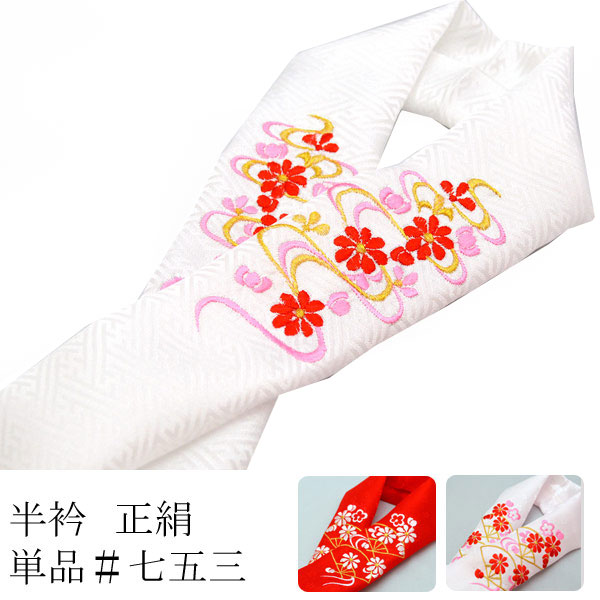 半衿を付けるだけでお顔周りが華やぎます。地色や刺繍によって、まったく印象が変わります。正絹は滑らかな質感と着け心地の良さが化繊とは違うところです。最近では省略されている着方が多く出回っておりますが、お着物を着る場合は長襦袢に半衿をお付けすることをお勧めいたします。