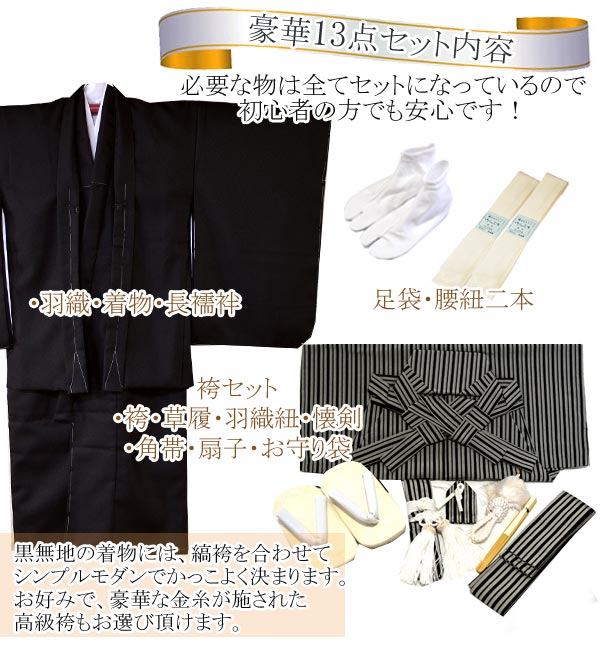 羽織、着物、長襦袢、羽織紐、角帯、袴、草履、懐剣、扇子、お守り袋、足袋(17-18cm、ストレッチタイプのソックス型)、腰紐2本。