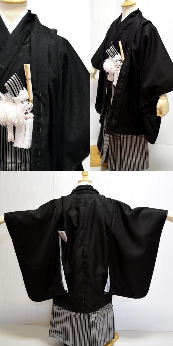 黒無地の着物、羽織にはお好みの紋を入れる事が可能です。