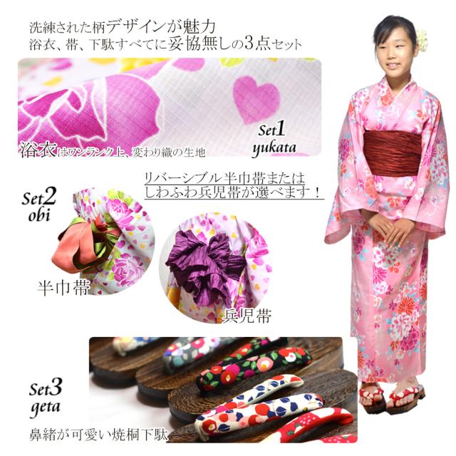 浴衣 ジュニア 女の子 3点セット 140cm 150cm ゆかた ( 浴衣 帯 下駄 )