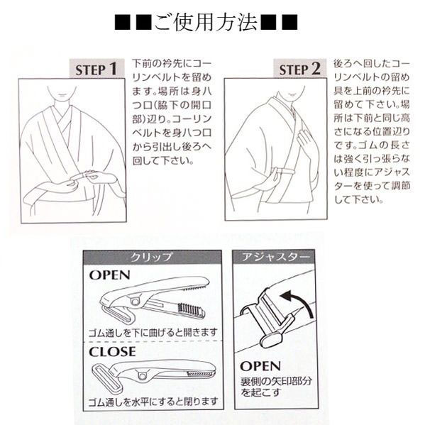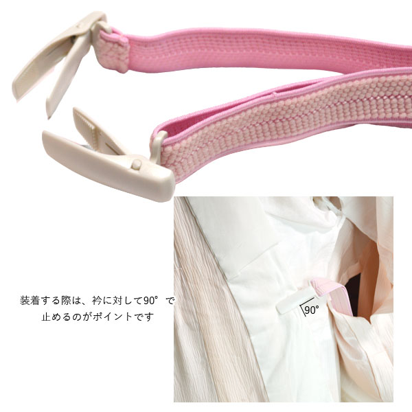 紐ではなくゴムを使用することで、扱いやすく緩むことがありません。また、しわになりにくく、胸を締め付けません。プラスチック製の留め具を使用することにより、着物を傷めることがなく、不快な結び目もできません。