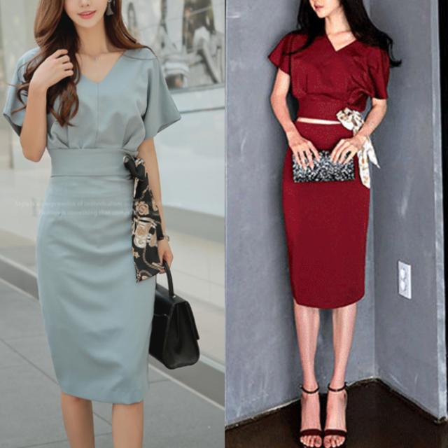 ウエストリボン セットアップ Vネック ミディアム丈 スプライスドレス 半袖 ドルマンスリーブ タイト 無地 スカーフ柄 通勤 オフィス OL お呼ばれ big_ac