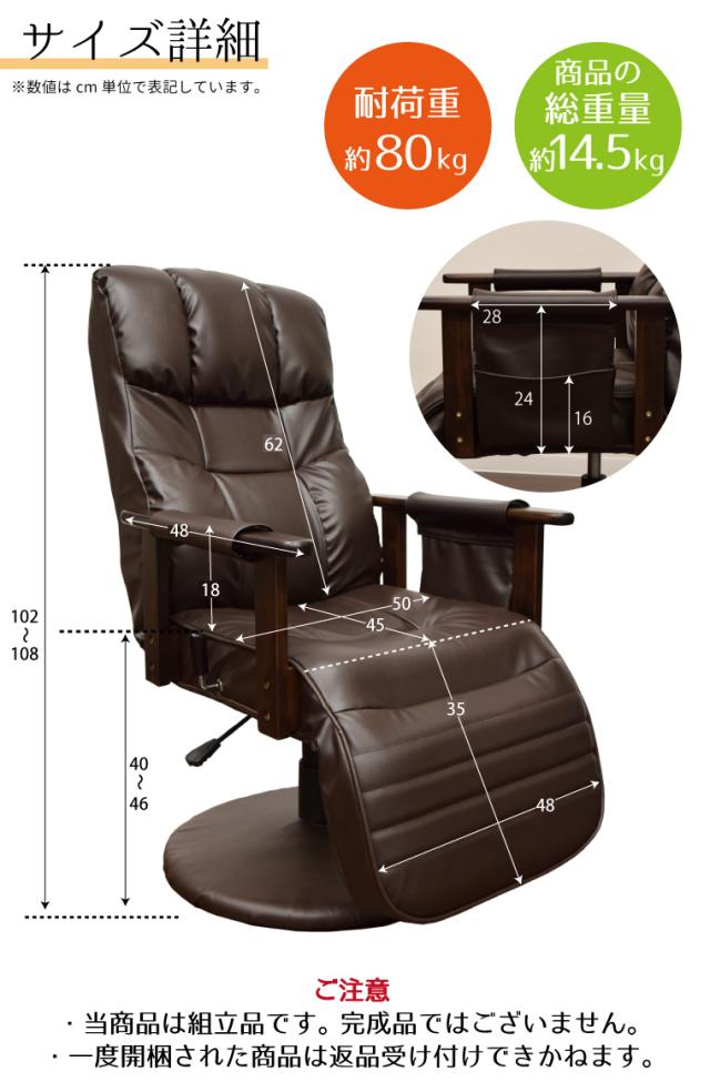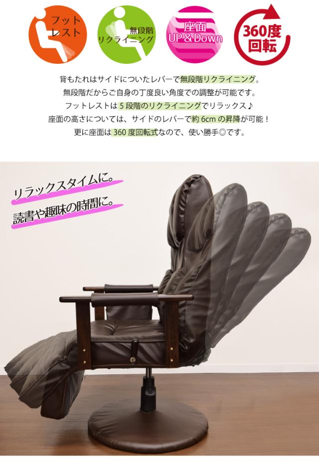 リクライニングチェア 送料無料 フットレスト付き 在宅勤務 昇降式リクライニングチェア 天然木肘付き 回転座椅子 約幅60×奥行き73〜128×高さ102〜108cm 座面高40〜46cm ブラウン 無段階 高さ調整 一部組立式