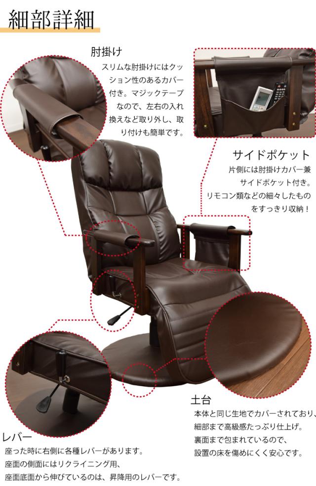 ・楽な姿勢を保てるハイバック仕様なので腰痛対策にも。 ・背面下部のふくらみが腰への負担を緩和します。 ・肘掛付で、360度回転するので動きやすく、スムーズな立ち上がりをサポートしてくれます。 ・水をはじく素材なので、お手入れしやすく扱いやすい素材です。汚れてもサッとひと拭き。扱いやすさ抜群です。 ・中材にウレタンフォーム、ポリエステル樹脂綿を使用しており、程よいクッション性と心地良い座り心地です。 ・無段階リクライニングで角度調整が可能。フットレストは5段階調整。つろぐ時の体勢に合わせ、調整してお使いいただけます 。・肘置き部分に収納カバーを取り付け可能。取り外しが簡単なマジックテープなので左右付け替えも楽々です。 ・肘置き部分はお洒落な天然木 | |