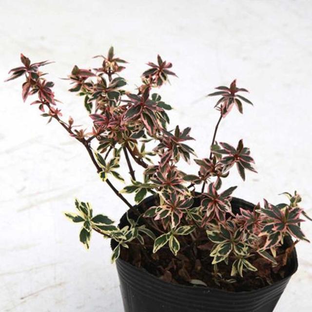 葉はアベリアの中でも小さく、暖かい時期は葉の縁にクリームホワイトの斑が入ります。 冬の寒さにあたると斑がピンク色に染まり、葉の変化を楽しむことができます。 初夏〜秋にかけて白い小花を咲かせ、成長が遅く、コンパクトなのが特徴です。 |