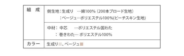 | 組成 | ■側生地 生成り:綿100% 200本ブロード生地 ベージュ:ポリエステル100%(ピーチスキン生地) ■中材 中芯:ポリエステル固わた 約1.2kg 巻きわた:ポリエステル100% 約1.2kg 総重量:約2.7kg |