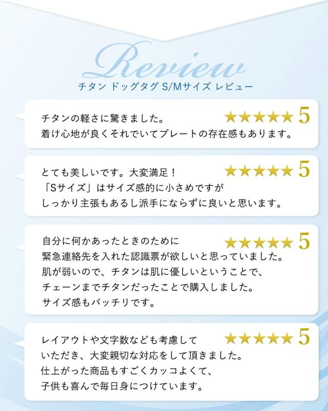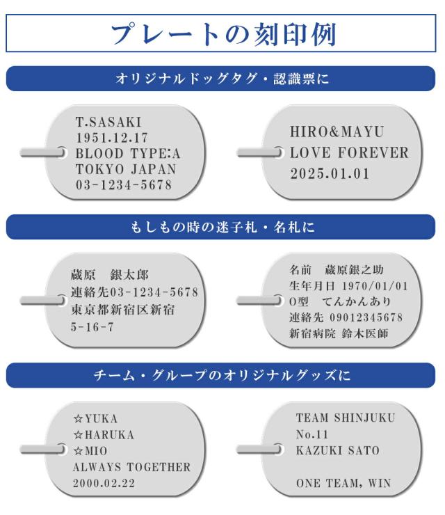 ドッグタグ(認識票)としてはもちろん!お好きな言葉などを刻んだオリジナルアクセ、記念日や名前を入れたペアアクセサリーや記念品としてなど、幅広い用途でお使い頂けます。
