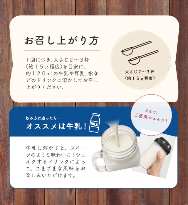 プロテインパウダー大さじ2〜3杯(約15g程度)と牛乳120ml程度をシェイカーで良く混ぜてお召し上がりください。