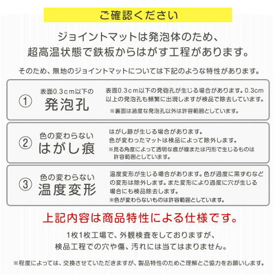 ※ジョイントマットに使用する樹脂素材については、より安全な素材となるよう技術の向上がなされており、その過程で現在使用している素材はPEと記載を行うことが適切となりましたので、2019年1月4日にEVAからPEに表記を変更しました。日本の大手量販店でも随時、記載の変更が行われており、品質を悪化させたものではありませんのでご安心ください。