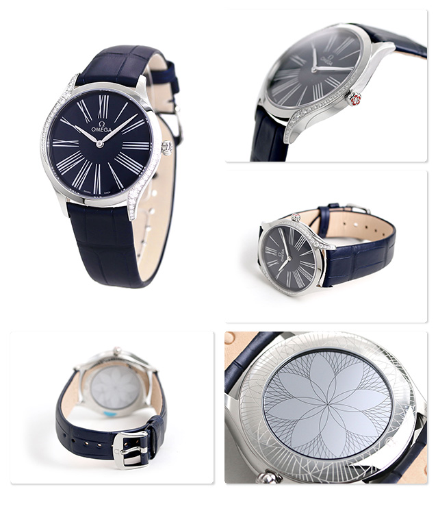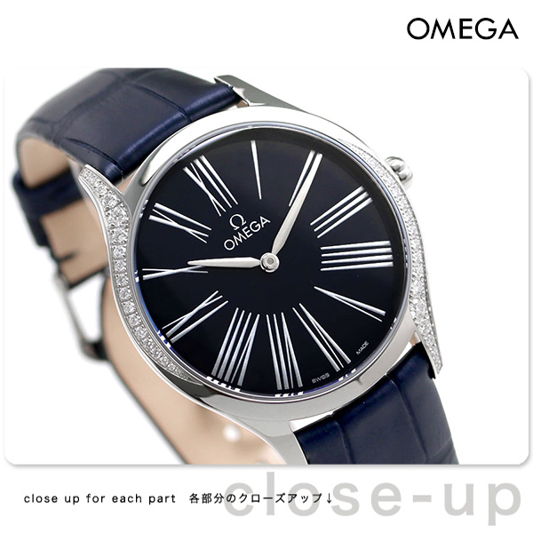 5年保証キャンペーン オメガ デビル トレゾア クオーツ 36mm ダイヤモンド クオーツ スイス製 レディース 腕時計 428-18-36-60-03-001 OMEGA DE VILLE TRESOR QUARTZ アナログ ネイビー 革ベルト ◆オメガは1848年、ルイ・ブランによってスイスにて設立された高級腕時計ブランドです。1894年に発表した懐中時計のムーブメント、「Ω(オメガ/達成と極致の意)」という言葉を正式な社名として採用しました。 スリムなケースはステンレススチール製で、両サイドを曲線に沿ってダイヤモンドが飾ります。リューズはレッドのハイセラムでポリッシュ仕上げが施されており、ダイヤモンド1個がセットされています。ラッカー仕上げのブルーのダイアルには、転写されたユニークなローマ数字とロジウムプレート加工の針が配されています。特殊な鏡面仕上げのケースバックには「Her Time」のパターンがあしらわれています。