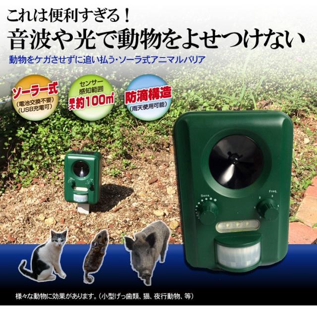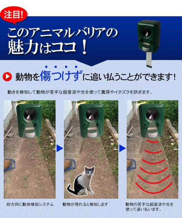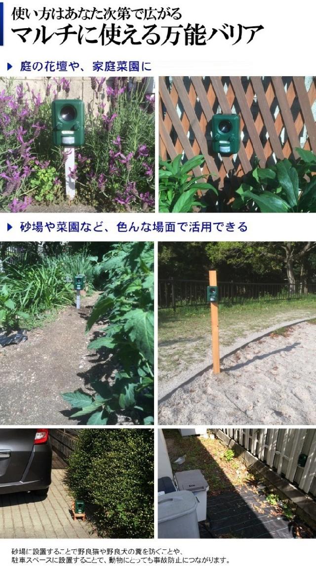 | 超音波とフラッシュライトで野生動物(猫、犬、ネズミ、キツネ、鳥、げっ歯類など)が近づきません。2つのコントロールボタンでセンサー感知範囲設定、稼動モードの選択が可能です。 アニマルバリアを設置するだけで、カーポートバリア・菜園バリア・お庭バリア・お砂場バリアが完成します。 | |