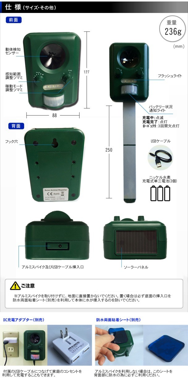 | ●センサー感知範囲 最大約100平方メートル ●ソーラー式で電池交換不要(USB充電可) ●防滴構造で雨天使用可能 | |
