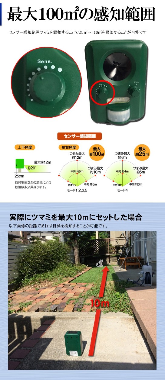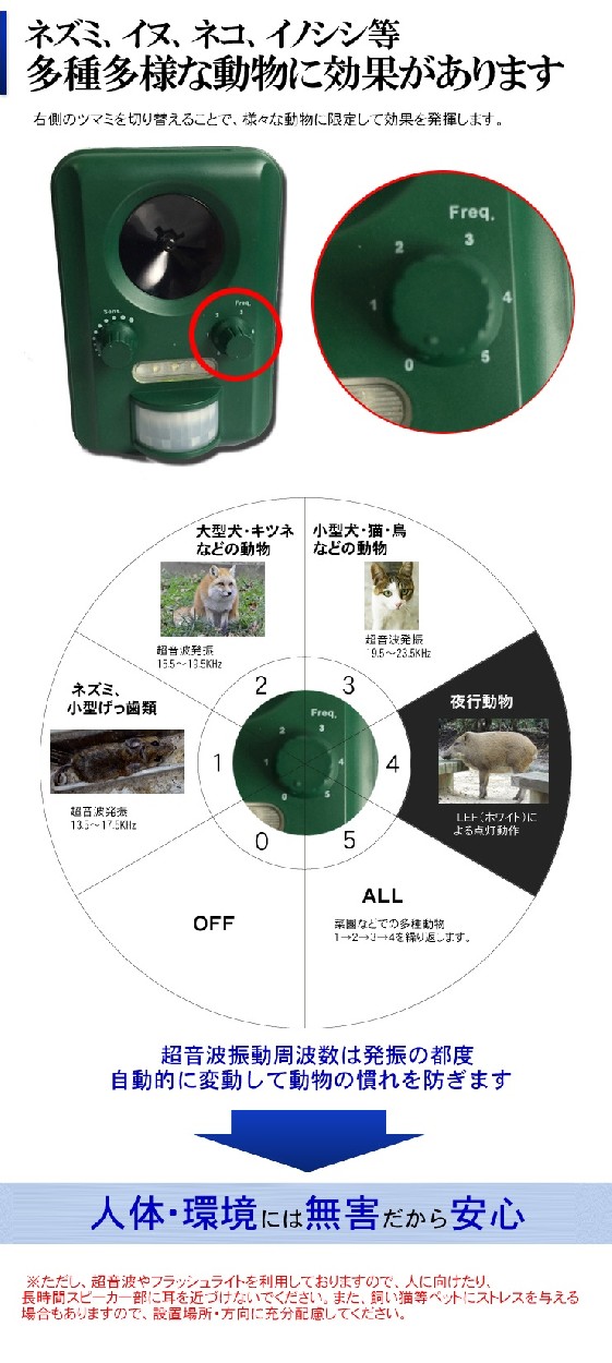 | 【モード0】 OFF 【モード1】 ねずみ、小型げっ歯類などの動物 / 超音波発振:13.5KHz〜17.5KHz 【モード2】 大型犬、キツネなどの動物 / 超音波発振:15.5KHz〜19.5KHz 【モード3】 小型権、ネコ、鳥などの動物 / 超音波発振:19.5KHz〜23.5KHz 【モード4】 夜行性動物 / LED(ホワイト)の点滅動作 【モード5】 菜園などでの多種動物 / モード1→2→3→4を繰り返し ※超音波発振周波数は発振の都度自動的に変動し、動物の慣れを防ぎます | |