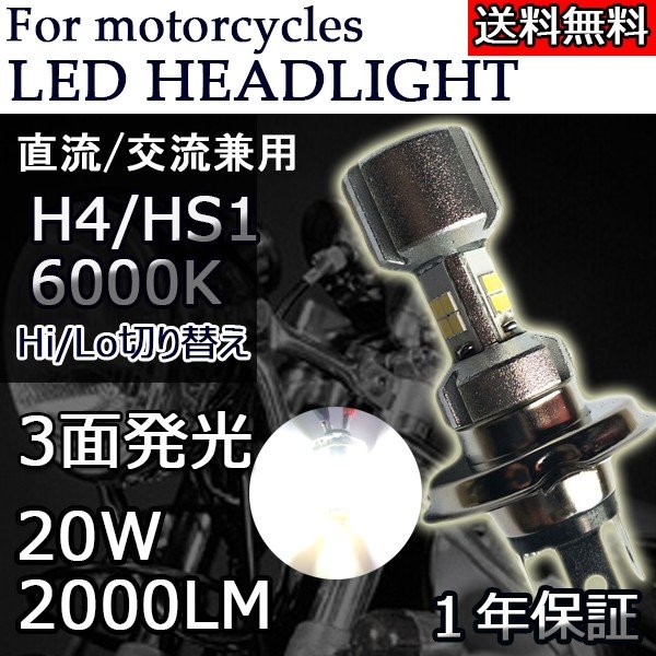 直流/交流兼用 H4 HS1選択可 Hi/Lo切替 LEDバイク ヘッドライト20W 2000Lm 採用3面発光 ホワイト 6000K 原付/オートバイ 1灯