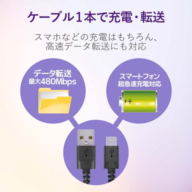 ●USB Standard-A端子を搭載したパソコン・充電器と、USB Type-C端子を搭載したスマートフォンなどの接続ができるUSB2.0ケーブル。