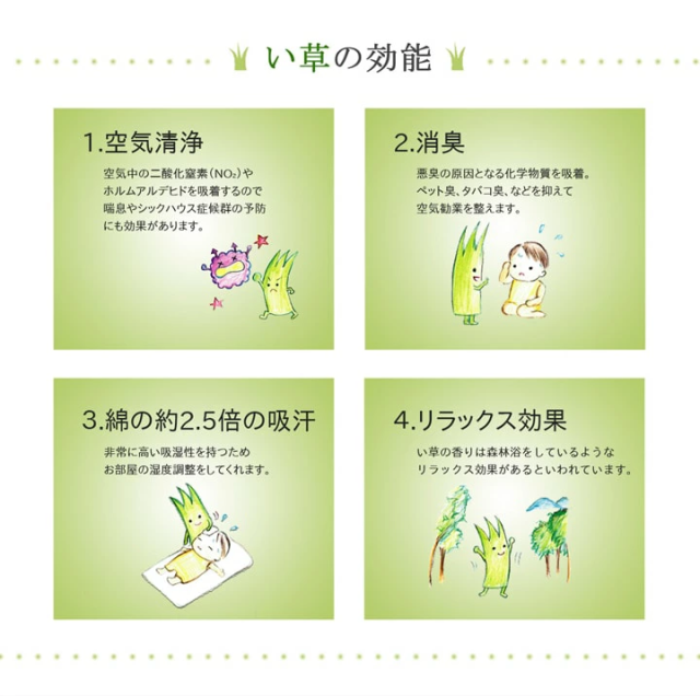 | ■ お父さんへのプレゼントとして毎年大好評の親父の場所シリーズのい草マットです。 ■ 寝っころがってテレビを見たり、折りたたんで腰かけたり、リビングでのお昼寝用に、などいろいろな使い方ができるフリーマットです。 ■ 中材には固わた40mmを使用していますのでフローリングでも快適にご使用頂けます。 ■ 快眠い草の効能として 1.綿の約2.5倍の吸湿力 2.蒸れにくい。汗による湿気を吸うことにより温度を下げ快適な就寝を促します。 3.汗のにおいを軽減。汗のにおいの元となる化学物質を90%以上抑えます。などがあります。 暑苦しい日本の夏でも汗のジメジメを軽減してくれます。 ■ 青森県のヒバの木から抽出した「ヒバエッセンス」をメーカー独自の技術で生地表面に加工しました。ヒバエッセンスにはヒノキチオールという天然物質が含まれており、抗菌防臭効果があります。 ■ なつかしい「い草」の香りに包まれた、落ち着きの場所をどうぞ。 |