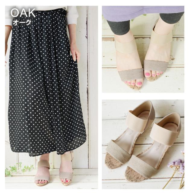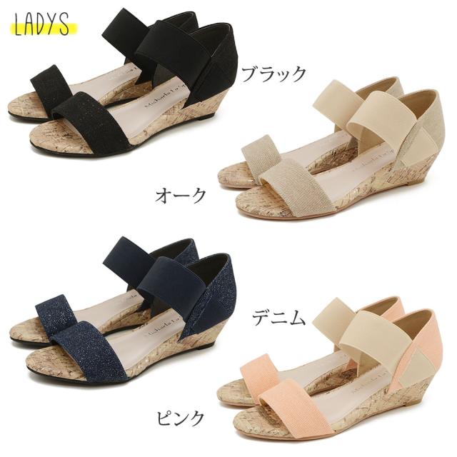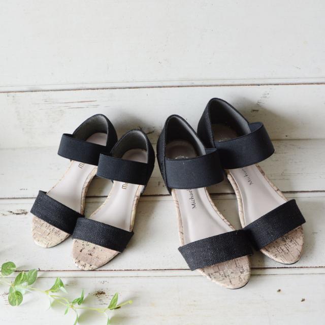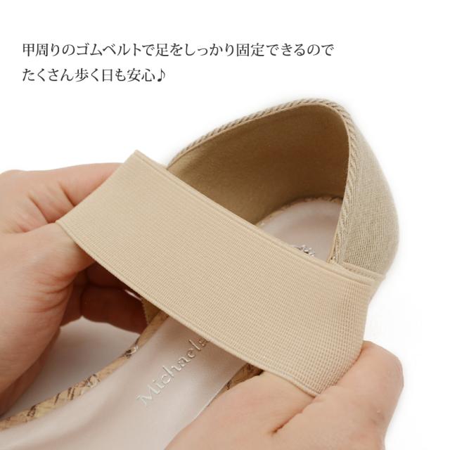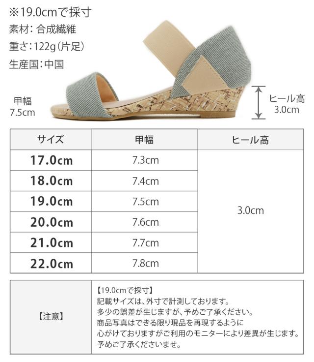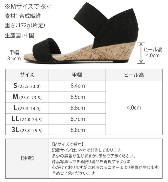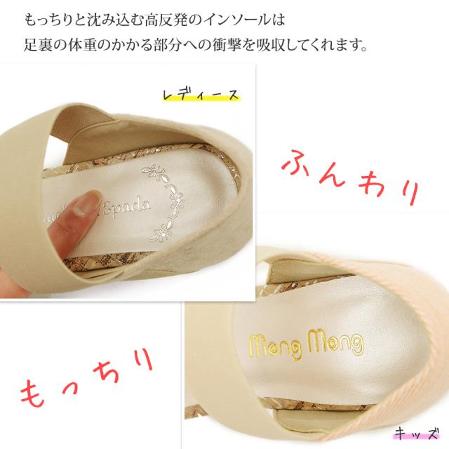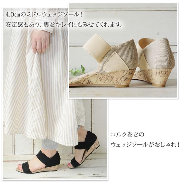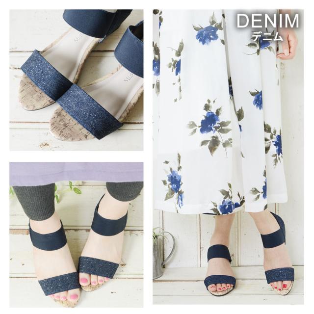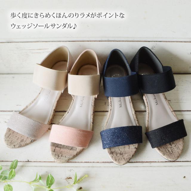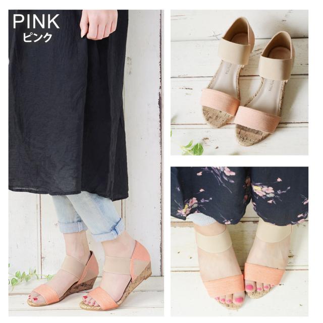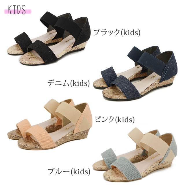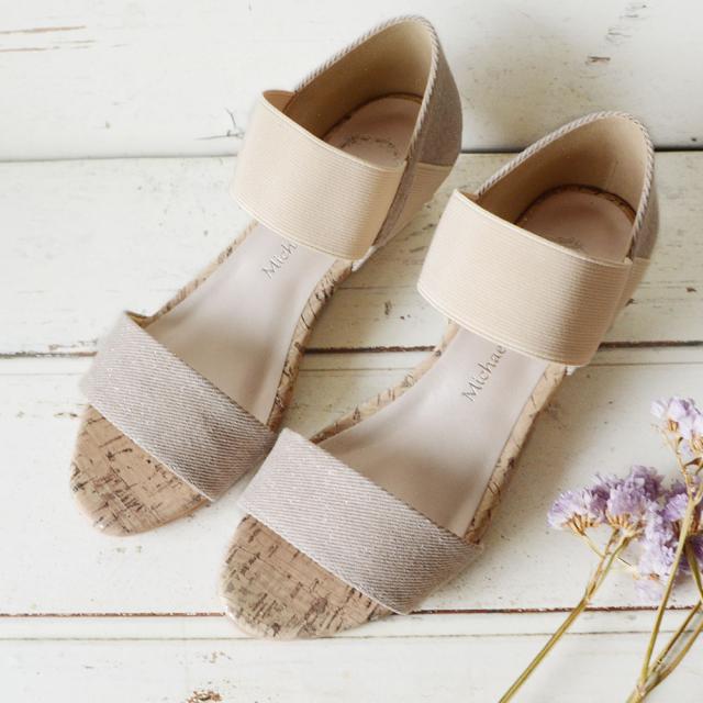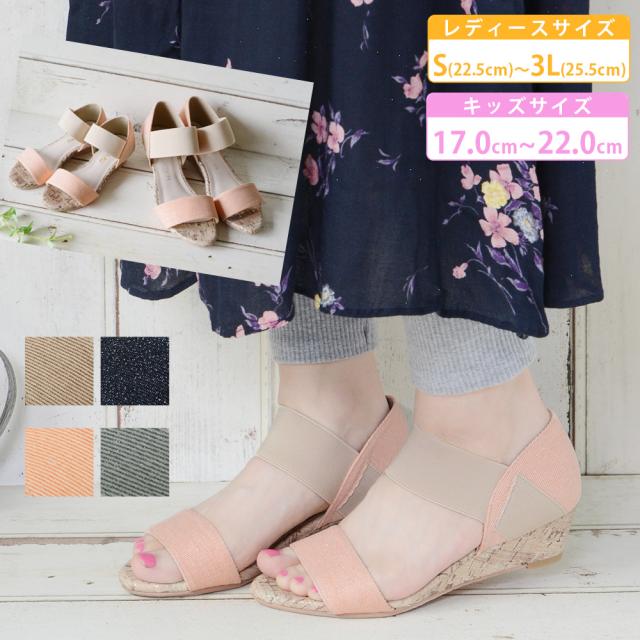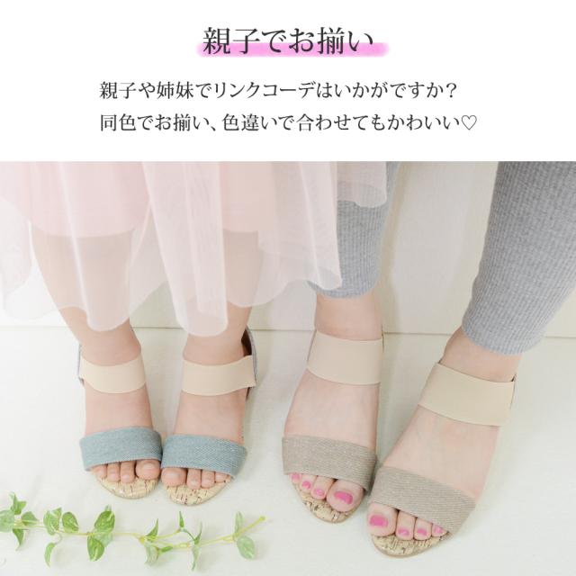 親子や姉妹でリンクコーデ♪同色or色違いで合わせてもかわいい◎靴擦れを防ぐため、裏側はメッシュ生地仕様でやわらかい。安定感もあり、足をキレイにもみせてくれ、歩くたびにきらめくほんのりラメがポイントなコルク巻き4.0cmのミドルウェッジソールサンダル!甲周りのゴムベルトでしっかり固定するので、歩く日も安心♪