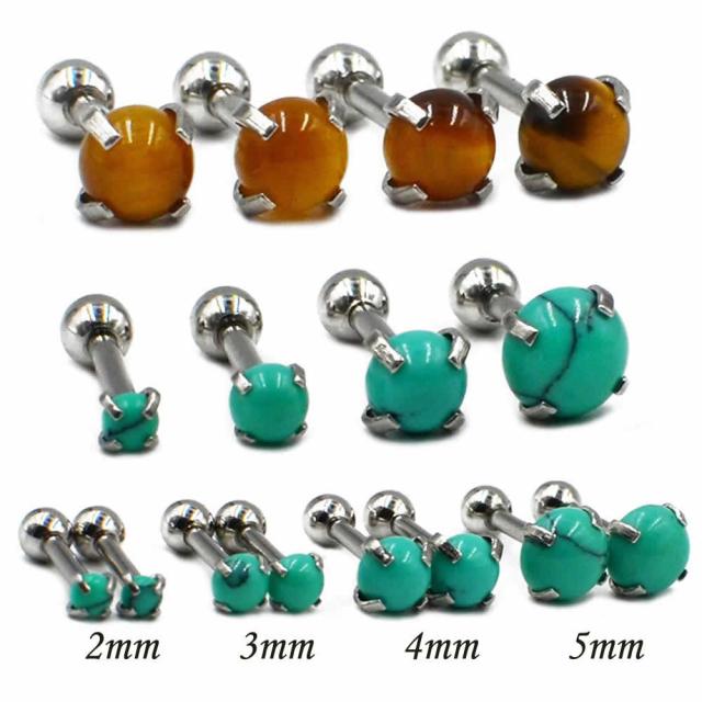 2mm、3mm、4mm、5mmサイズの天然石ターコイズとタイガーアイを立て爪で固定した16ゲージのストレートバーベル型ボディピアス。