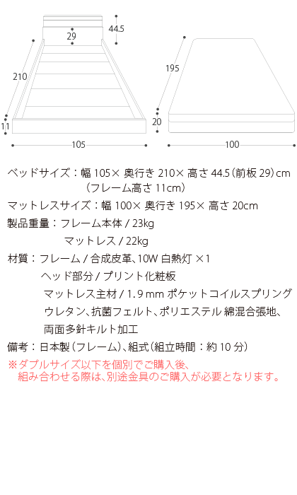 ベッド ローベッド フロアベッド シングル マットレス付き 日本製 北欧 モダン シングルサイズ シンプル bed おしゃれ 照明付き 宮付 PALATE(パレート)シングルサイズ ブラウン ホワイト SGマーク付ポケットコイルマットレスセット