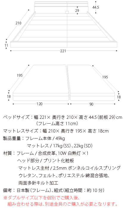ベッド ローベッド フロアベッド ワイド キング 宮付 照明付 マットレス付き キングサイズ 日本製 すのこ 北欧 シンプル モダン ブラウン ホワイト フロアベッド PALATE(パレート) ワイドキング210 SGマーク付ボンネルコイルマットレスセット
