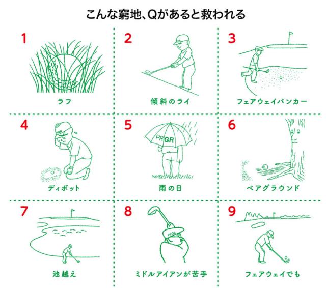 Qは「ラフ、フェアウェイバンカーなど、難しいライからのショット」をやさしくするクラブです。アマチュアゴルファーの多くが、例えば深いラフからのショットを苦手にしています。実は、Qの開発担当者もその一人。グリーンに乗せられないまでも、パワー・技術に関係なく、グリーンに近づけられるクラブはできないかと考え、Qを開発しました。どんな状況下でもあきらめず、前向きにパーが狙えたら、ゴルフもスコアも、もっと楽しくなるはずです。