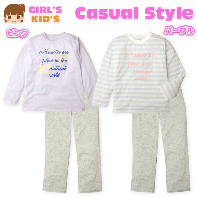 【送料無料】子供服 女の子 パジャマ 長袖 上下組 天竺 ロゴプリント ボーダー 女児 キッズ 120cm 130cm【メール便対応】