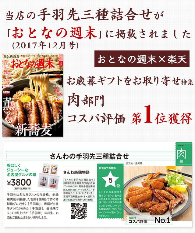 3つの名古屋めしが勢揃い!甘辛のたれが幅広い年代から好評を頂いている手羽先の唐揚げ、 特製塩だれと黒胡椒がアクセントの手羽塩焼き、 駅売店や高速道路SAでもお馴染み手羽煮の詰合せ商品です。名古屋めしといったら手羽先!の皆様に贈る贅沢セットです。