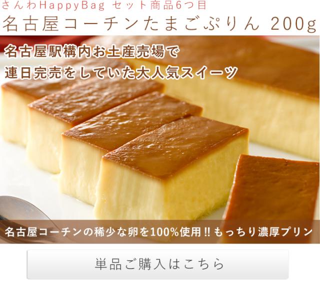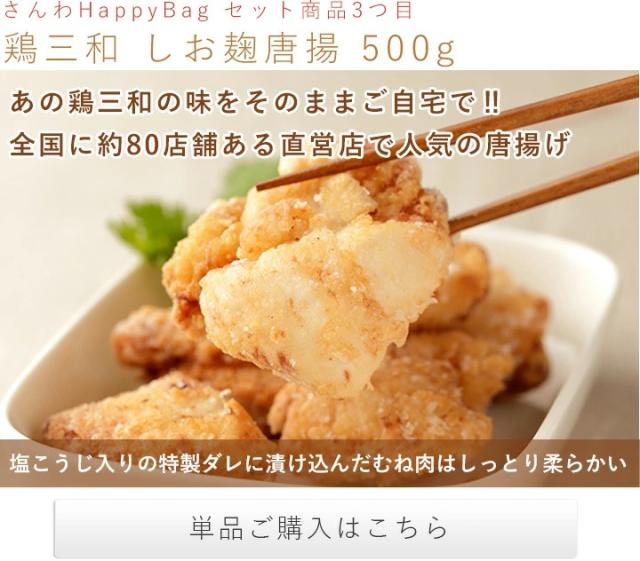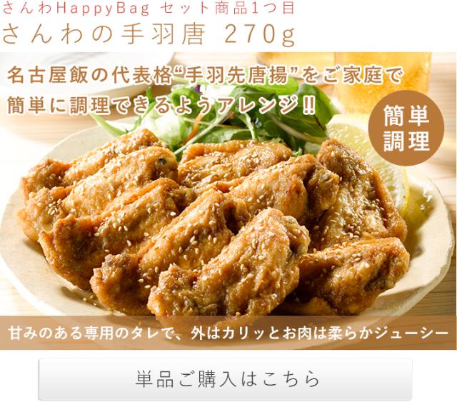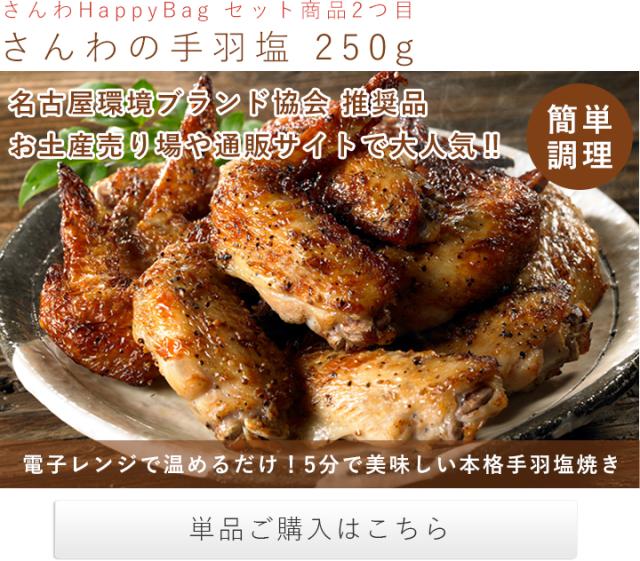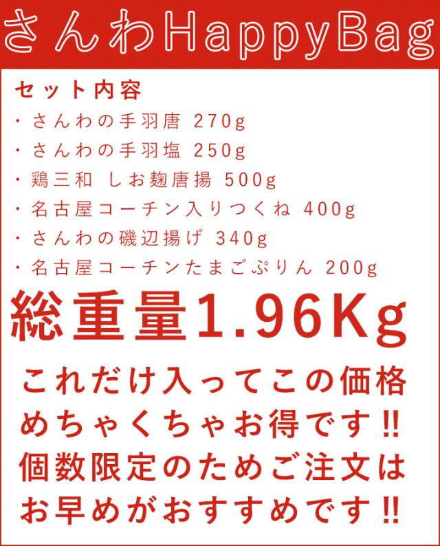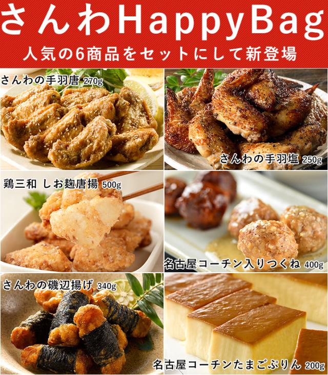手羽唐、手羽塩、塩こうじ唐揚、名古屋コーチンつくね、さんわの磯辺揚げ、名古屋コーチンたまごぷりんが入って、HappyBagなら6,480円!総重量約1.96kgもあり、本当にお得です!