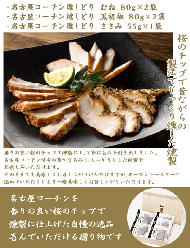 | 内容量 | 名古屋コーチン燻しどり 黒胡椒(80g)×2 名古屋コーチン燻しどり むね(80g)×2 名古屋コーチン燻しどり ささみ(55g)×1 |