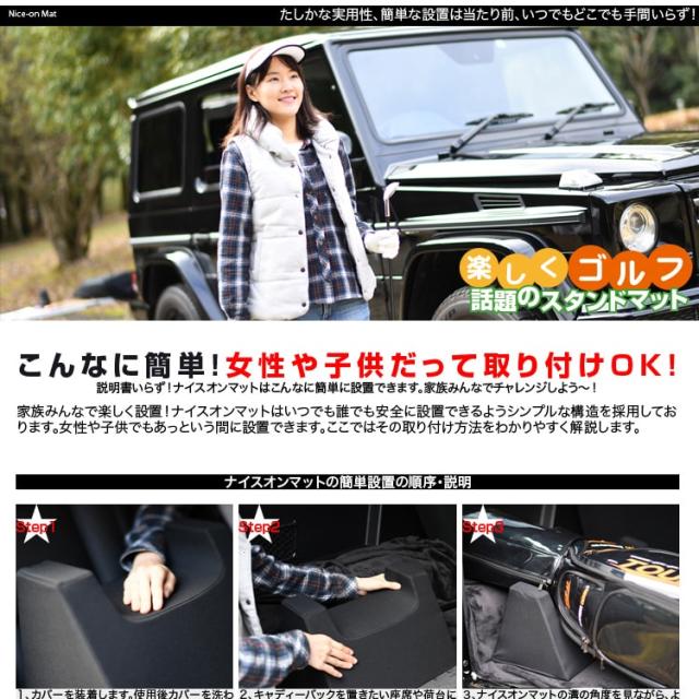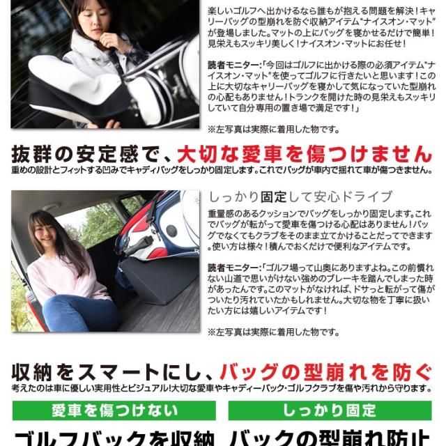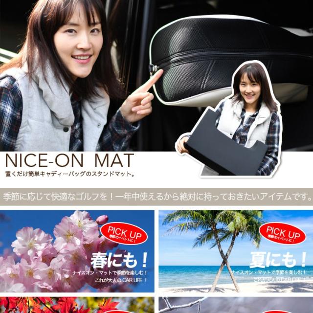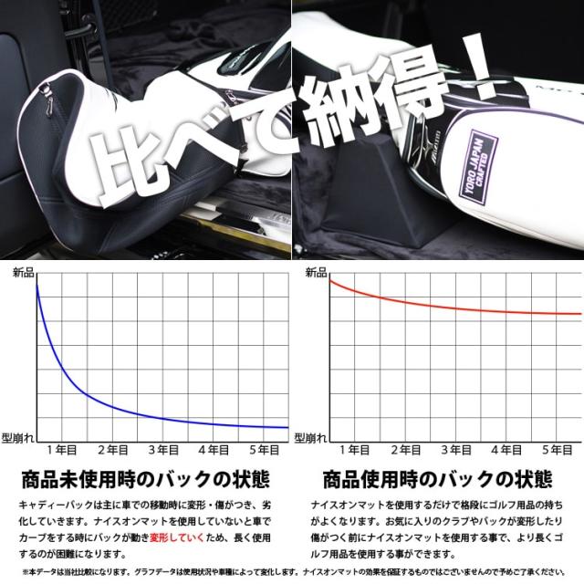 キャディーバッグスタンドマット「ナイスオン・マット」は商標・意匠登録された商品です。商標・意匠権を侵害する模倣品を製造・販売・輸入することは法律で禁じられており、権利侵害が発見された場合、規約に基づき出店停止処分となります。