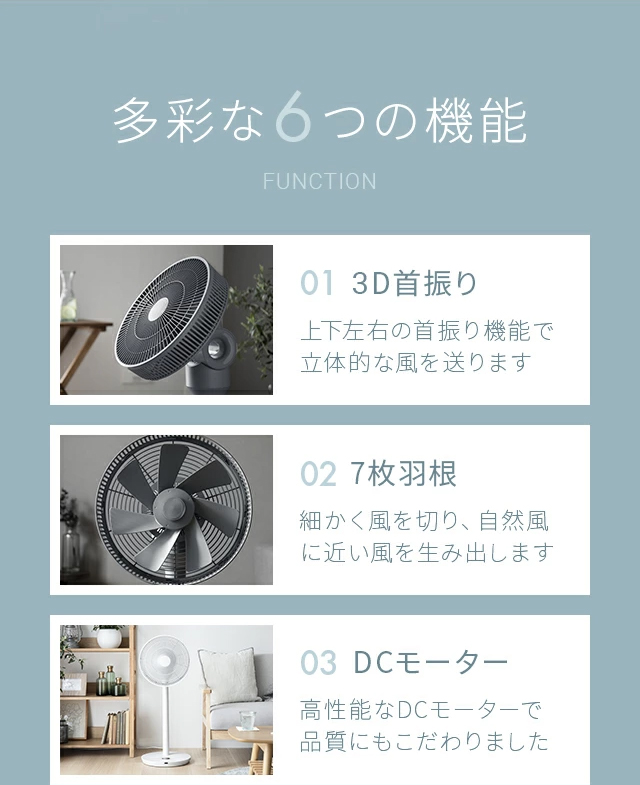 - 首振りがスムーズ。風切り音は弱めにまわせは静かだけど強く回すと普通の音。リモコン置くところが欲しかった。