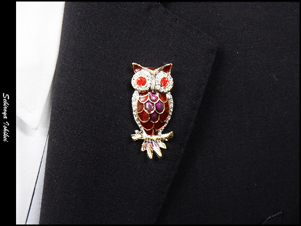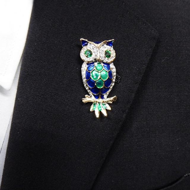 ◆ラペルピン◇スワロフスキー◆フクロウ ゴールド×緑×青 メール便可